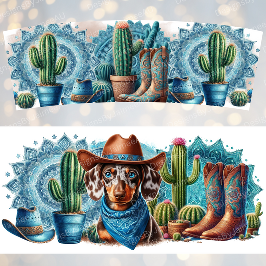 Blue Country/Western Themed Chocolate Dapple Dachshund 40oz Digital Sublimation Tumbler Wrap