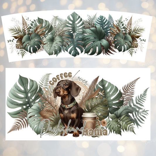 Chocolate "Coffee Lover, Dachshund Mama" Greens and Browns Tropical 40oz Digital Sublimation Tumbler Wrap