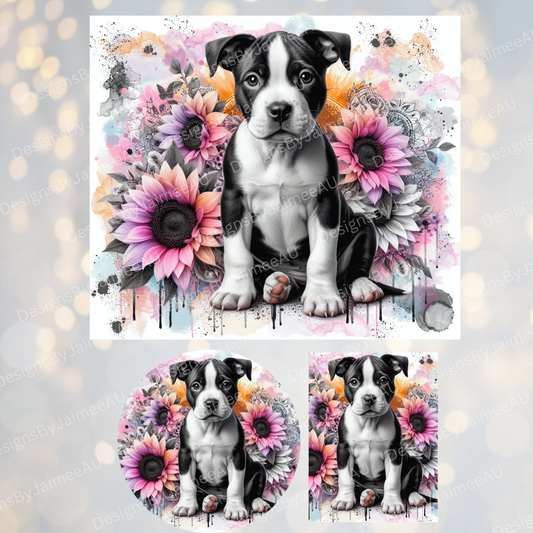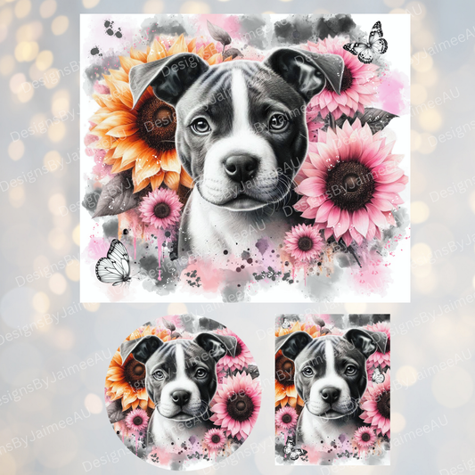 Watercolour Staffy - Pink and Black Sunflowers Set - Includes Digital 20oz Sublimation Tumbler Wrap, Car Coaster and Air Freshener Designs