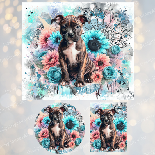 Pastel Watercolour Brindle Staffy #2 - Sunflowers Set - Includes Digital 20oz Sublimation Tumbler Wrap, Car Coaster and Air Freshener Designs