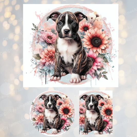 Pastel Watercolour Staffy - Sunflowers Set - Includes Digital 20oz Sublimation Tumbler Wrap, Car Coaster and Air Freshener Designs