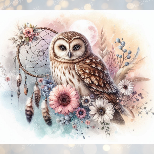Soft Pastel watercolour Owl With Flowers and Dream Catcher Digital 20oz Sublimation Tumbler Wrap