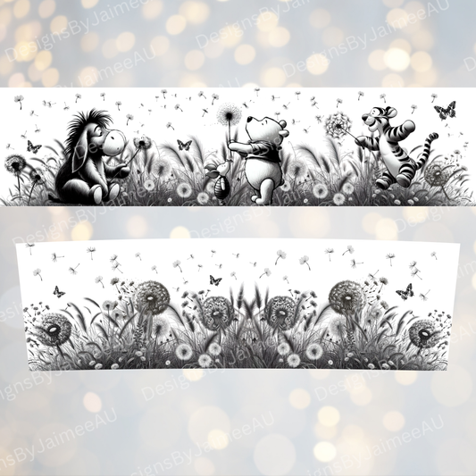 Dandelions - Winnie The Pooh and Friends -Black and White Line Drawing- Digital 20oz Tumbler with Handle Wrap Design