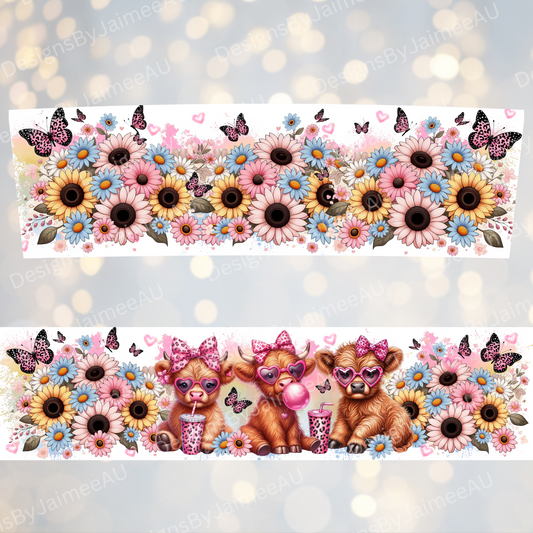Cute Highland Cows with Leopard Print Butterflies and Daisies - Digital 20oz Tumbler with Handle Wrap Design