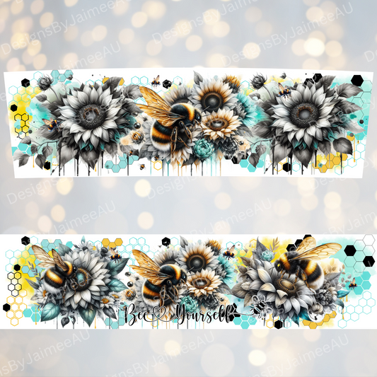 Bee Yourself -Black and White Bees with pops of Aqua and Yellow- Digital 20oz Tumbler with Handle Wrap Design