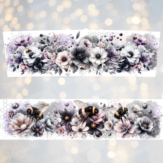 Black and White Bees and Flowers with pops of Purple- Digital 20oz Tumbler with Handle Wrap Design