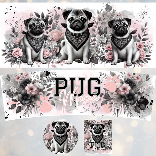 Pug Mama - Pink and Black - Set (Includes Car Coaster and Air Freshener Designs) - Digital 30oz Sublimation Tumbler Wrap