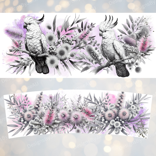 Black and White Cockatoo and Australian Natives, Pops of Purple- Digital 30oz Sublimation Tumbler Wrap