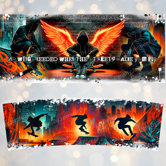 "No Wings Needed when the streets make you fly" - Urban Skateboard - Digital 30oz Sublimation Tumbler Wrap