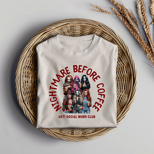 "Nightmare Before Coffee" Antisocial MUMS/MOMS Club - Horror Movie Character Inspired Digital DTF Transfer PNG Image