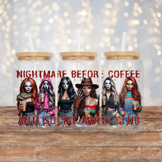 "Nightmare Before Coffee" - Antisocial MUMS/MOMS Club - Horror Movie Characters Inspired Digital 16oz UV DTF Transfer Wrap PNG Image