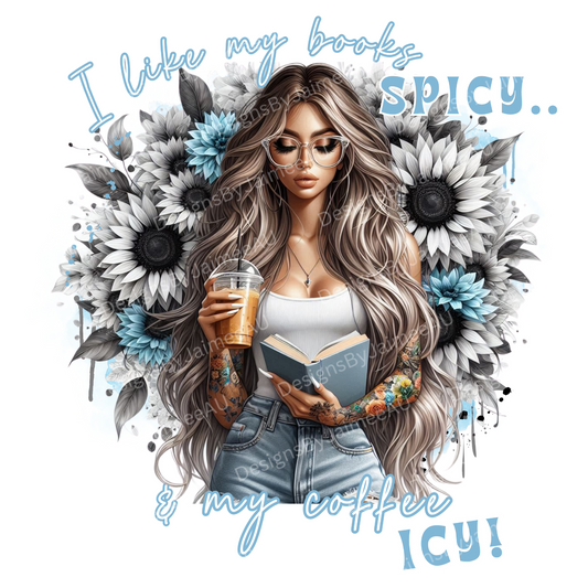 Blue "I like my books SPICY and my Coffee ICY!" Book girlie Digital DTF Transfer PNG Image