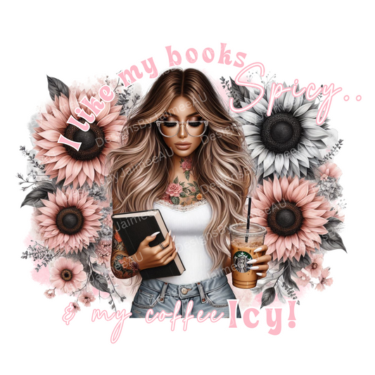PINK "I like my books SPICY and my Coffee ICY!" Book girlie Digital DTF Transfer PNG Image