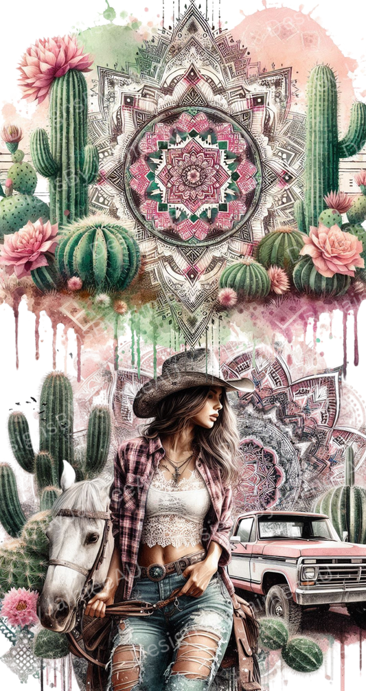 Pink and Green Cowgirl with Horse and Pick Up Truck Country/Western Digital Phone Case Design