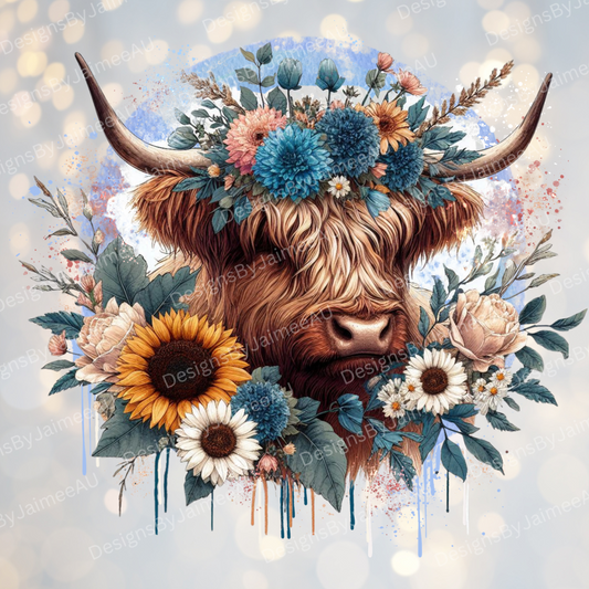 Boho Blue Highland Cow Digital DTF Transfer PNG Image