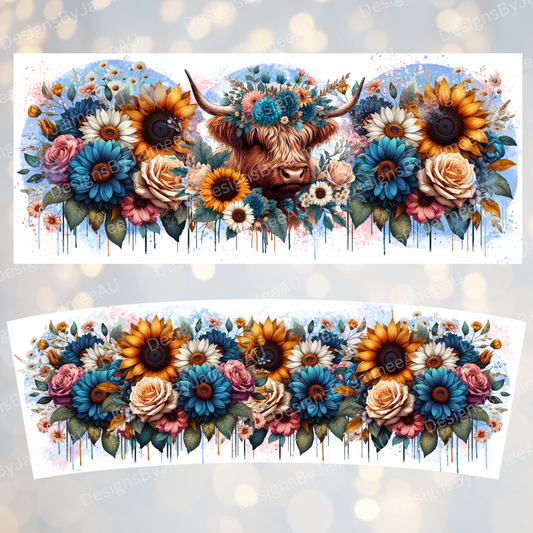 Boho Blue Highland Cow - 40oz Digital Sublimation Tumbler Wrap