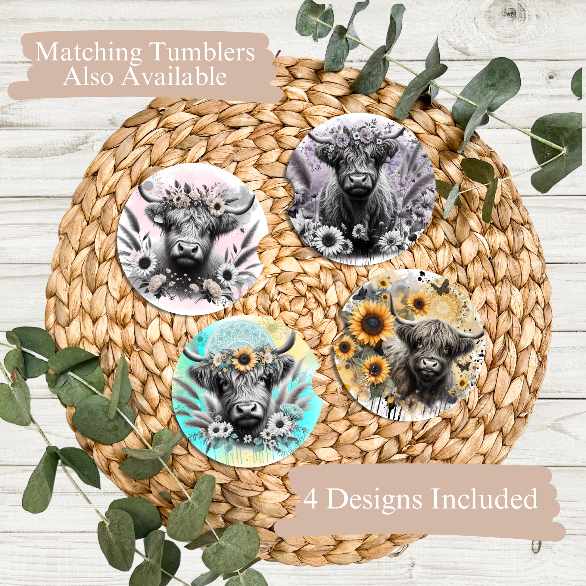 4 Sunflower Baby Highland Cow Digital Sublimation Car Coaster Designs