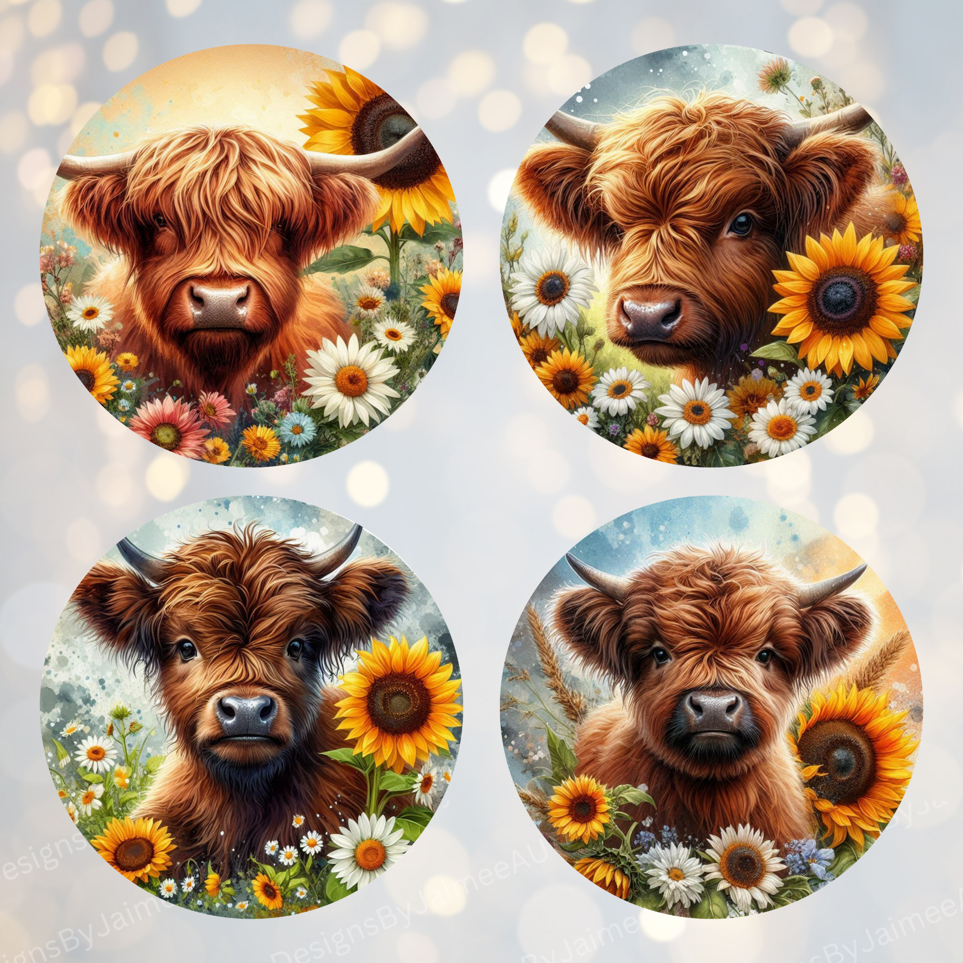 4 Sunflower Baby Highland Cow Digital Sublimation Car Coaster Designs