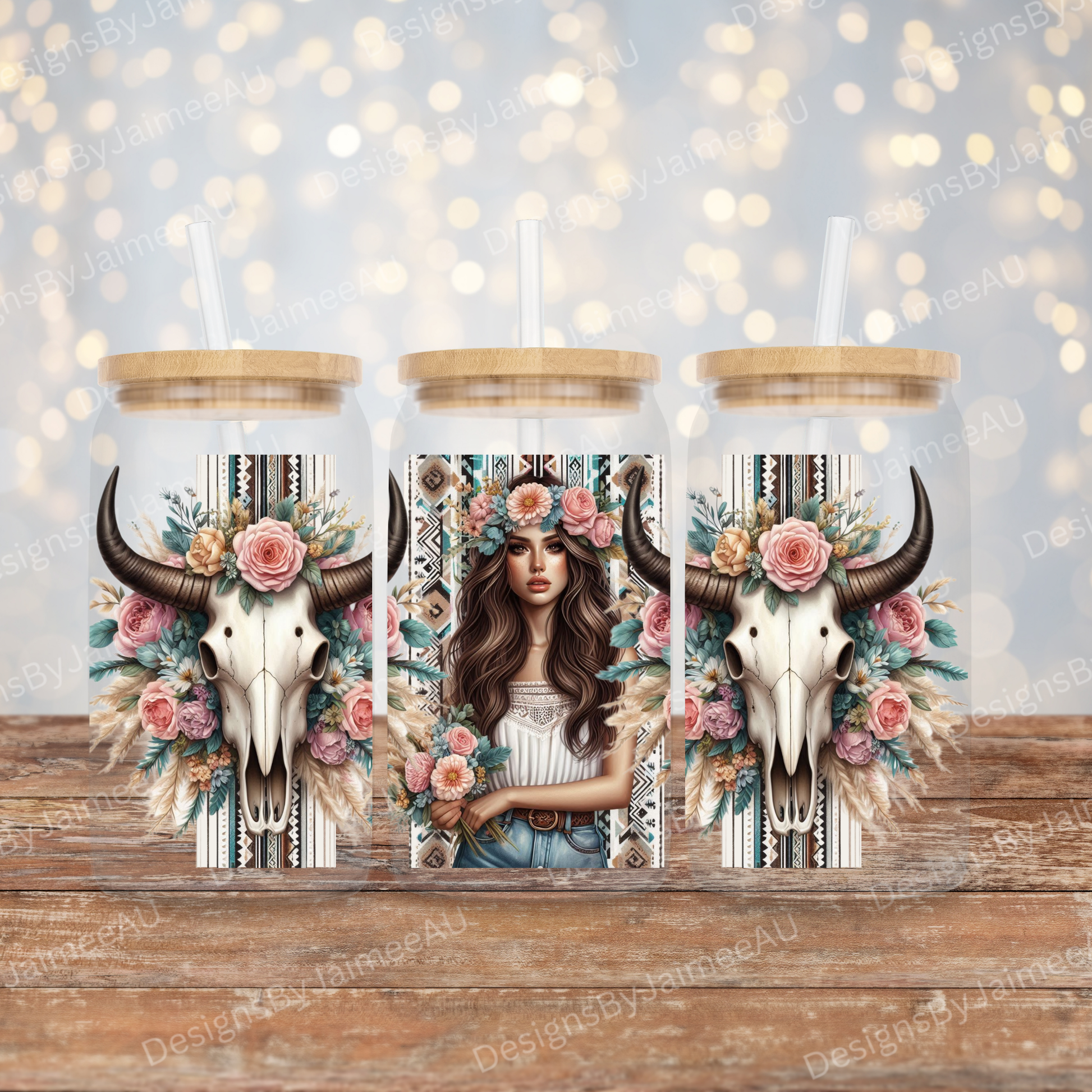 Aztec Bull Skulls and Woman, Pastel-Boho 16oz UV DTF Transfer Wrap PNG Image