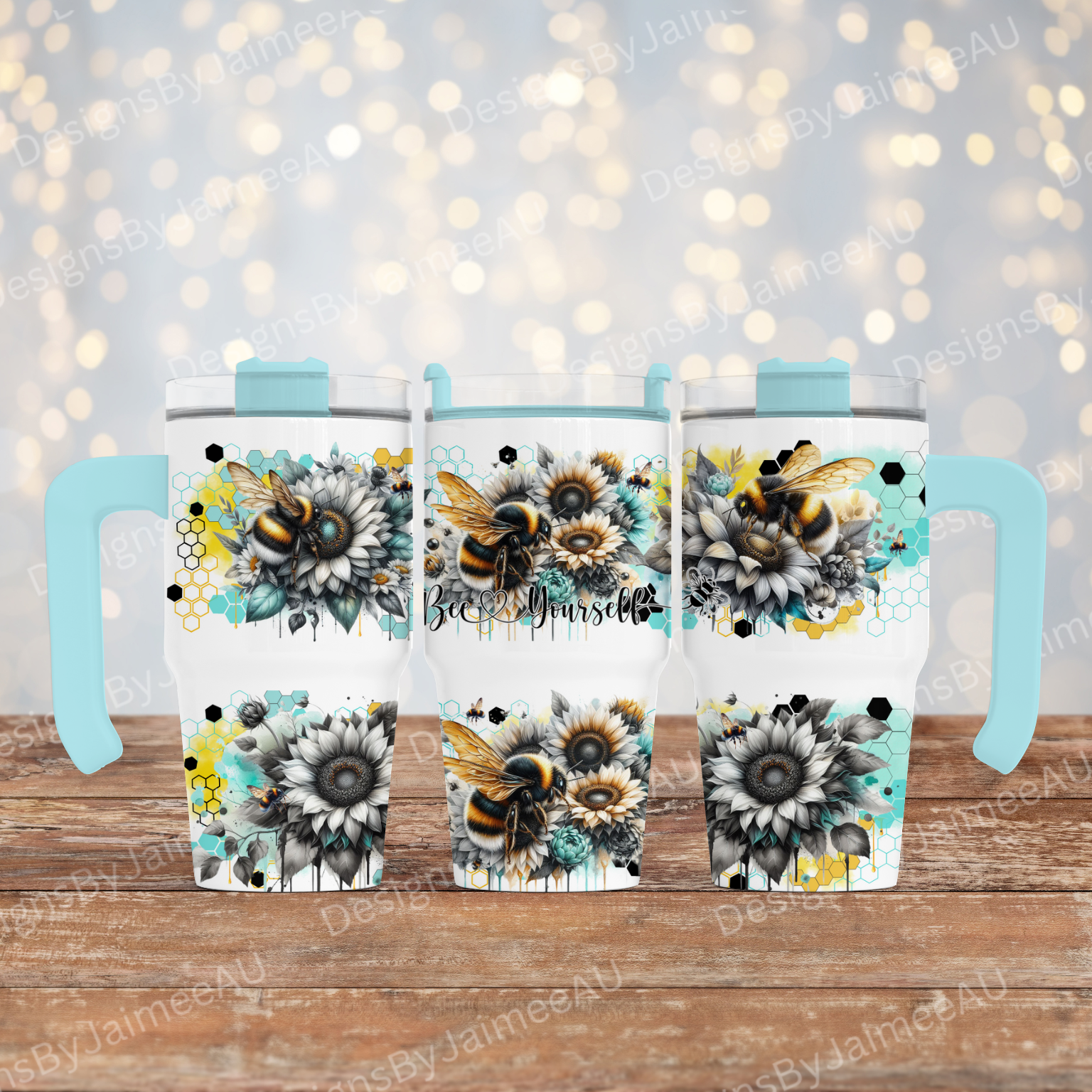 Bee Yourself -Black and White Bees with pops of Aqua and Yellow- Digital 20oz Tumbler with Handle Wrap Design