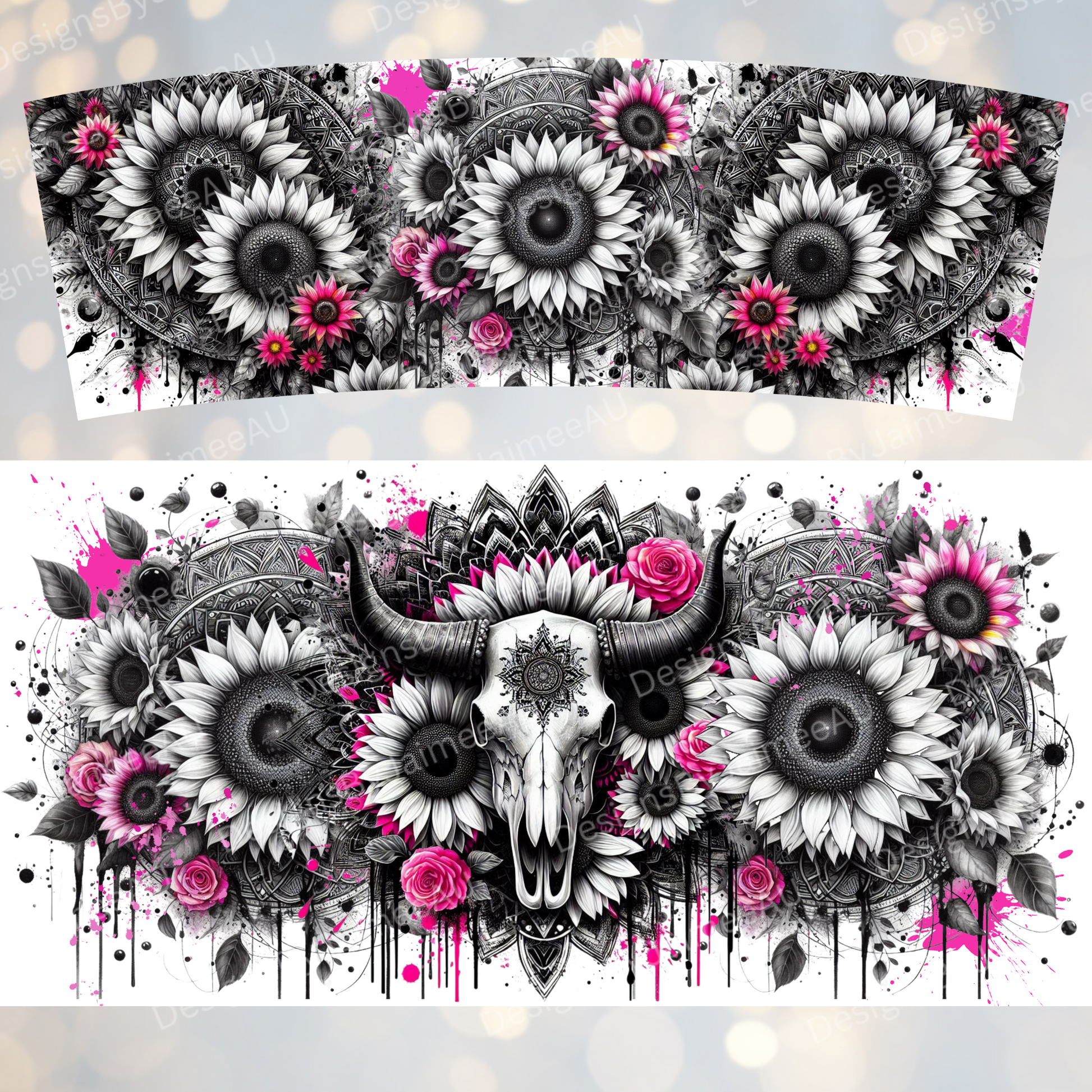 Black and White Bull Skull with Pops of Pink 40oz Digital Sublimation Tumbler Wrap
