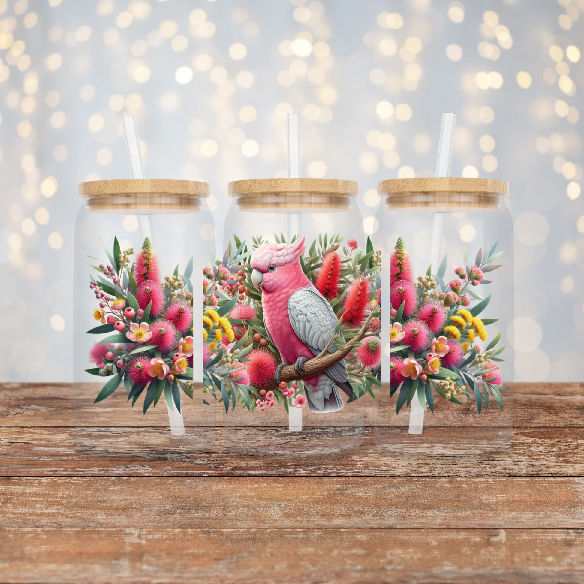 Galah and Aussie Native Flowers Digital Download 300dpi 16oz UV DTF Transfer Wrap PNG Image