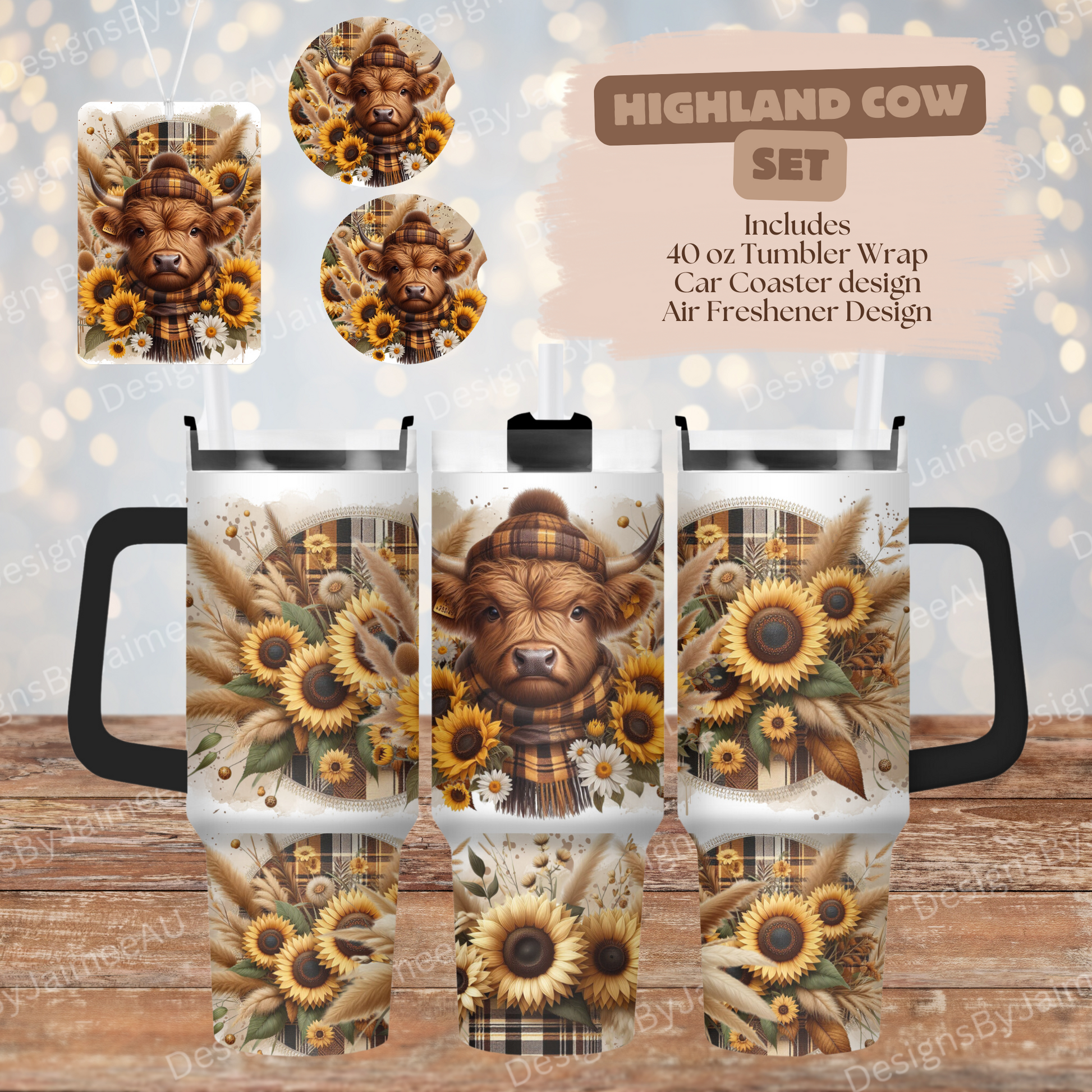Gingham Highland Cow 40oz Digital Sublimation Tumbler Wrap, Air Freshener and Car Coaster Set