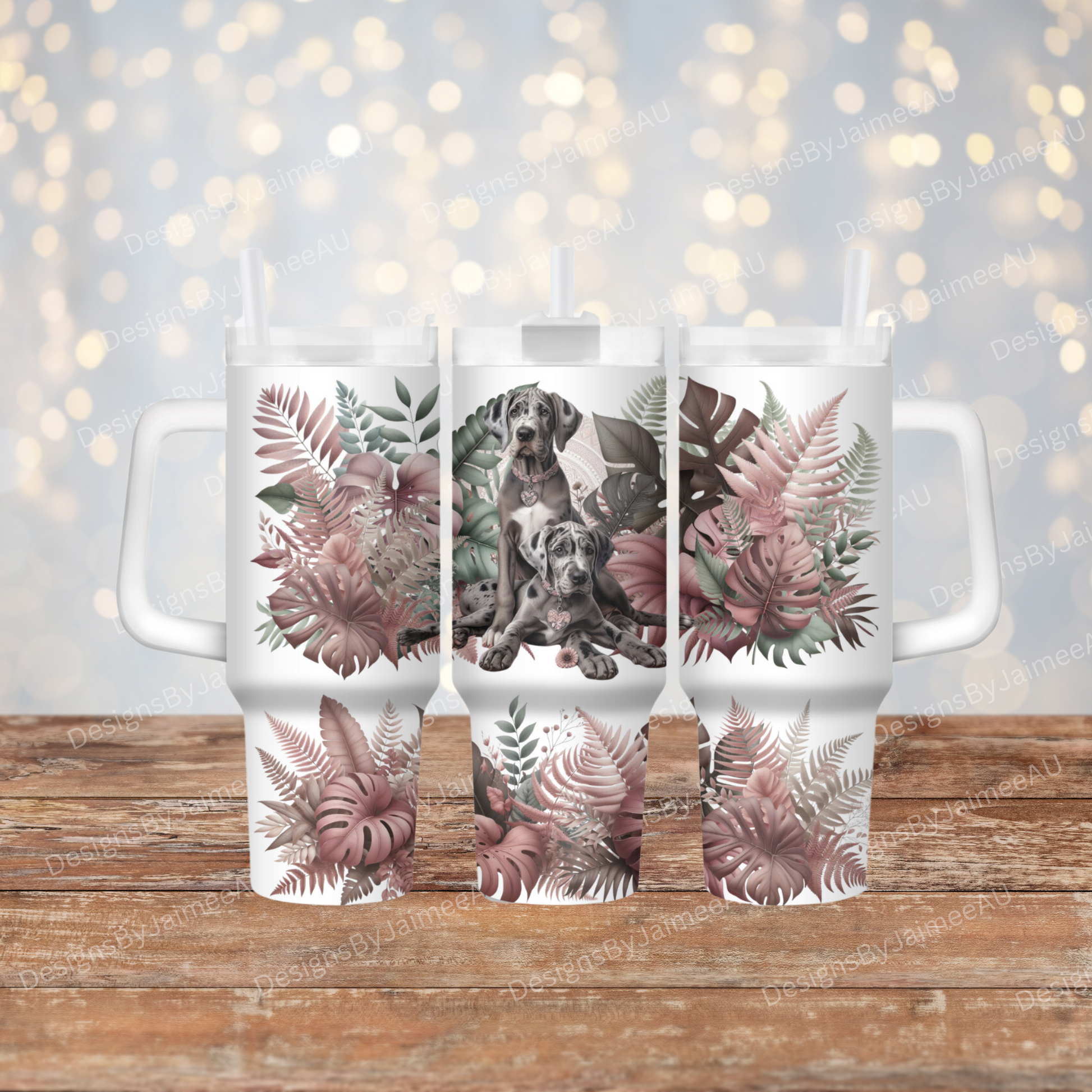 Great Dane, Earthy Pinks and Browns Tropical Leaves Digital Download PNG 40oz Sublimation Tumbler Wrap