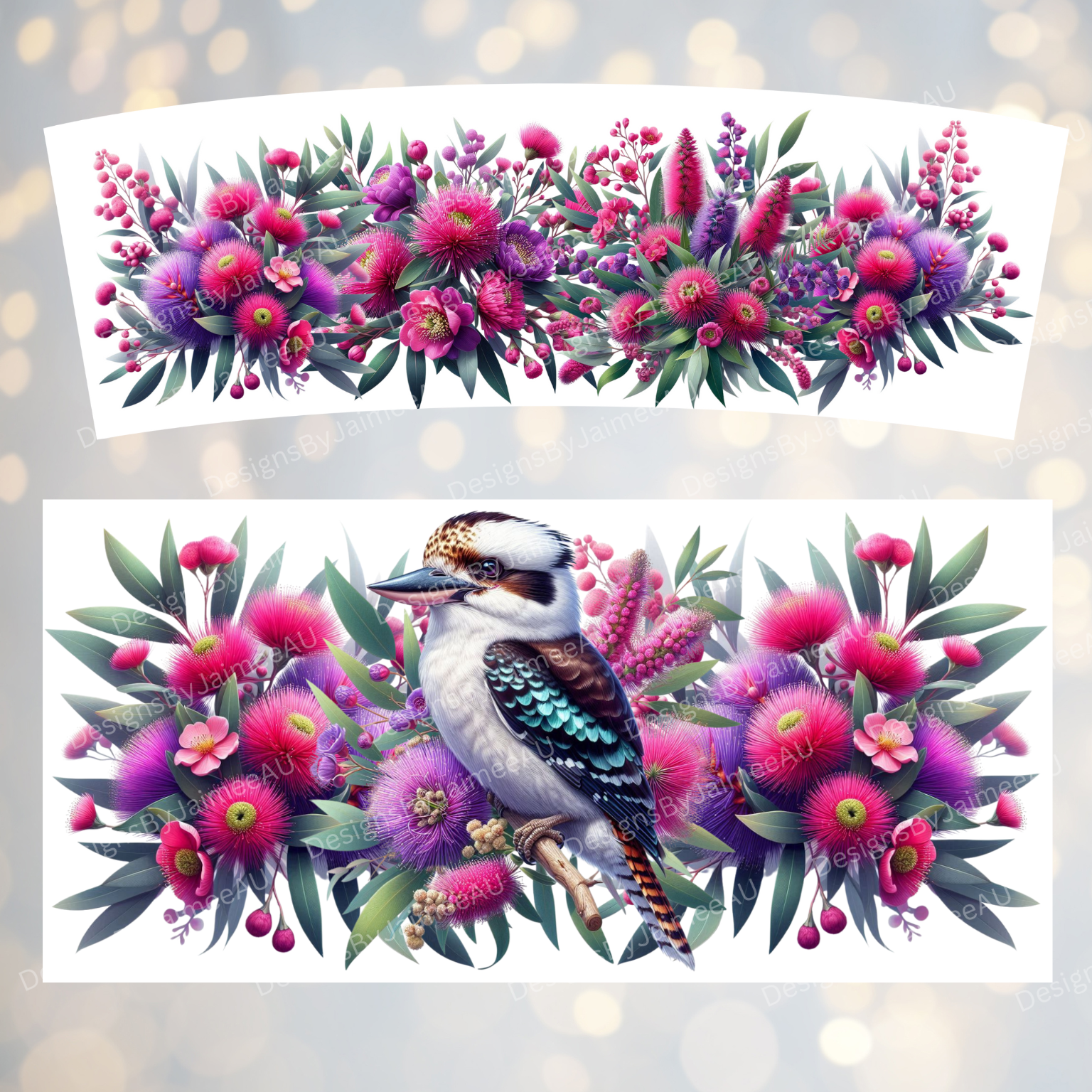 Kookaburra with Pink and Purple Australian Native Flowers Digital Download PNG 40oz Sublimation Tumbler Wrap