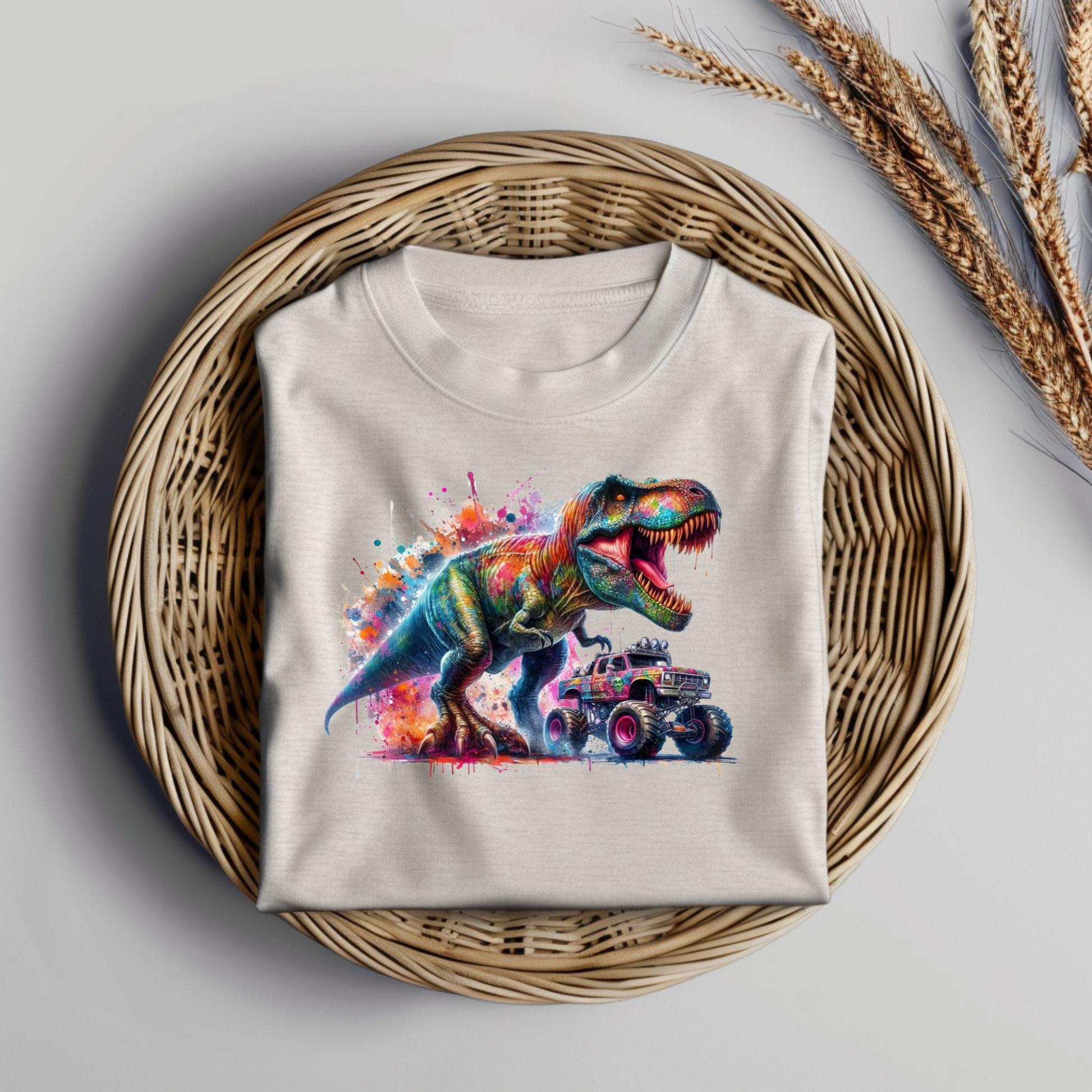 Vibrant Watercolour T-Rex and Monster Trucks #2 Digital Download PNG 300dpi DTF Transfer tshirt image