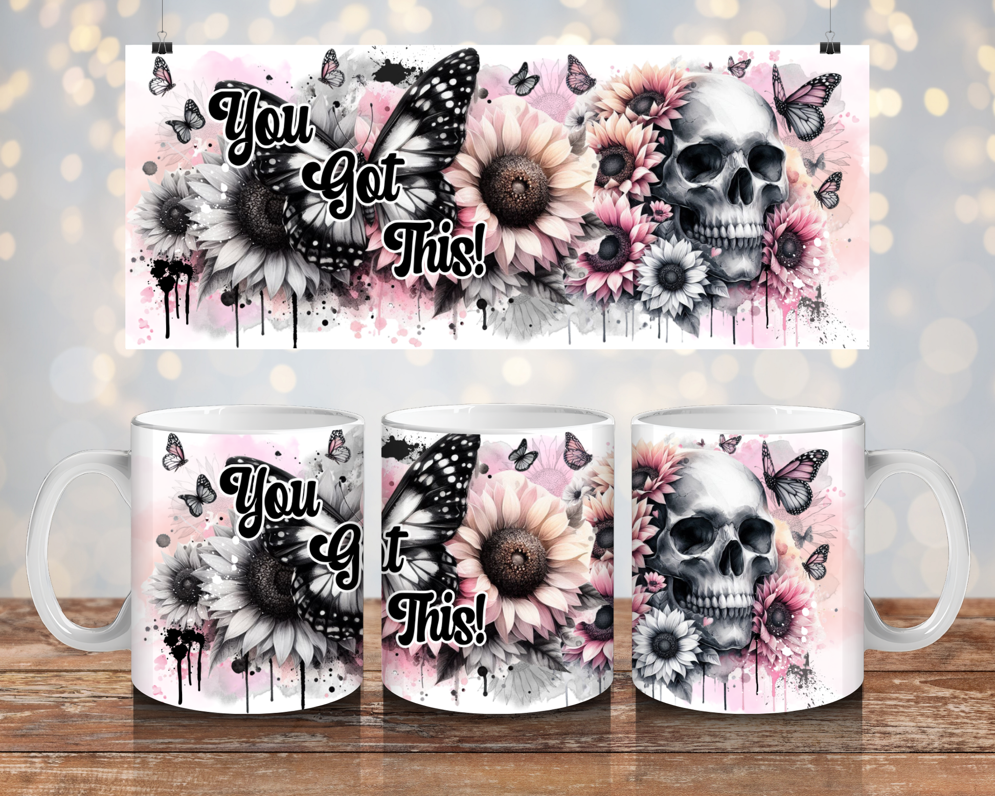 You Got This - Pink and Black Floral Skull - Digital 11oz Sublimation Coffee Mug Design